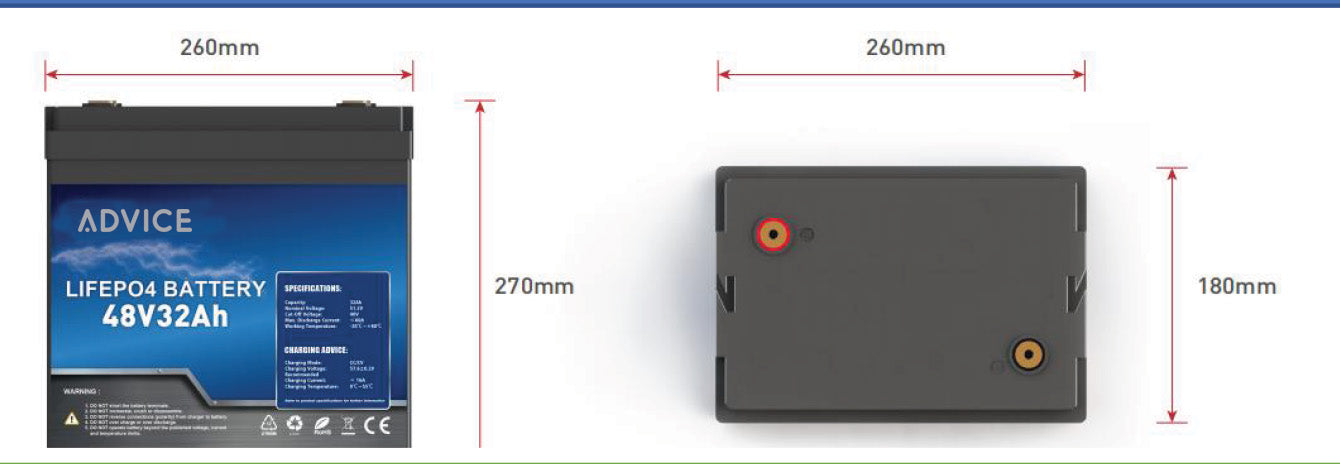 Nominal Voltage 51.2VRated Capacity (77°F/25°C) 32Ah @0.5CCircuit Protection Over charge, Over discharge, Over current, Over temp, Short, BalanceDimensions: 260*180*270mmApprox Weight: 13.8Kgמפרט טכני: