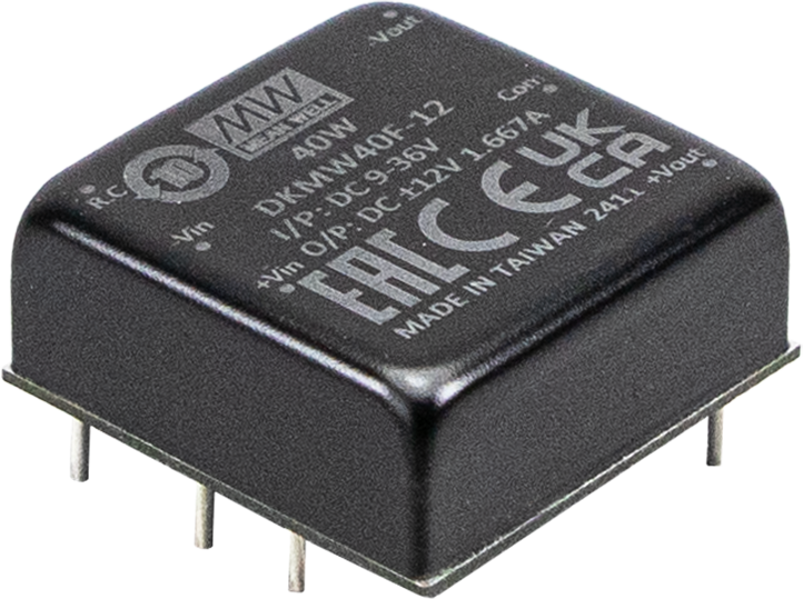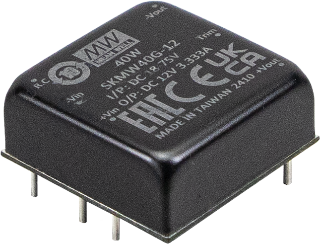 SKMW40 and DKMW40 series are 40W isolated and regulated module type DC-DC converter with DIP 1"x1" package. It features international standard pins, a high efficiency up to 91%, wide working temperature range -40~+80°C, 2KVDC I/P-O/P isolation voltage, compliance to BS EN/EN55032 Class A/B with additional components, continuous-mode short circuit, overload, over temperature, input under voltage protection, remote ON/OFF and trimmable output voltage etc. The models account for different input voltage 9-36V and 18~75V 4:1 ultrawide input range, and various output voltage, 3.3V/5V/12V/ 15V/24V for single output and +12V/±15V for dual outputs, which are suitable for all kinds of systems, Such as industrial control, telecommunication field, distributed power architecture, and so on.