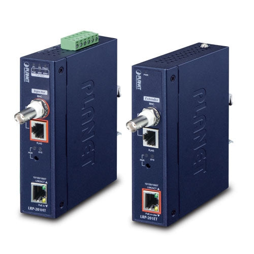 The LRP-201-KIT, a PLANET Long Reach PoE solution, is an Industrial Single-port Ultra PoE over Coaxial/UTP Extender Kit featuring long range data and power transmission over any existing coaxial, UTP cable or telephone wire for distance up to 600 meters (1,968ft.) and converts power to IEEE 802.3at/bt PoE over another 100-meter Ethernet cable connected to the remote PoE PD. The LRP-201-KIT provides multi applications for easy plug-n-play operation and deployment in climatically demanding environments with wide temperature range from -20 to 70 degrees C. It makes the installation of remote PoE PDs easier and more efficient.